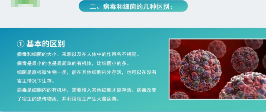 病毒是一种能像针一样插入人体的寄主细胞,通过感染细胞并复制遗传信息,然后利用寄主的细胞进行自我复制的非细胞型生物;细菌是一种单细胞生物----与人类共同生存的微生物,一个细菌就是一个个体,主要机构是核蛋白体,无其它细胞器,但可以自行分裂繁殖。